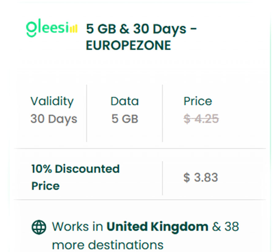 Avoid SIM card hassle, store visits, and roaming charges. Gleesim’s eSIM for UK gives you fast, secure data from the moment you arrive—no physical SIM, no delays. Whether you’re traveling for business, tourism, or study, our eSIM keeps you connected across the UK’s top networks. Choose the best eSIM for UK, activate instantly, and enjoy seamless browsing, navigation, and communication anywhere in the country.